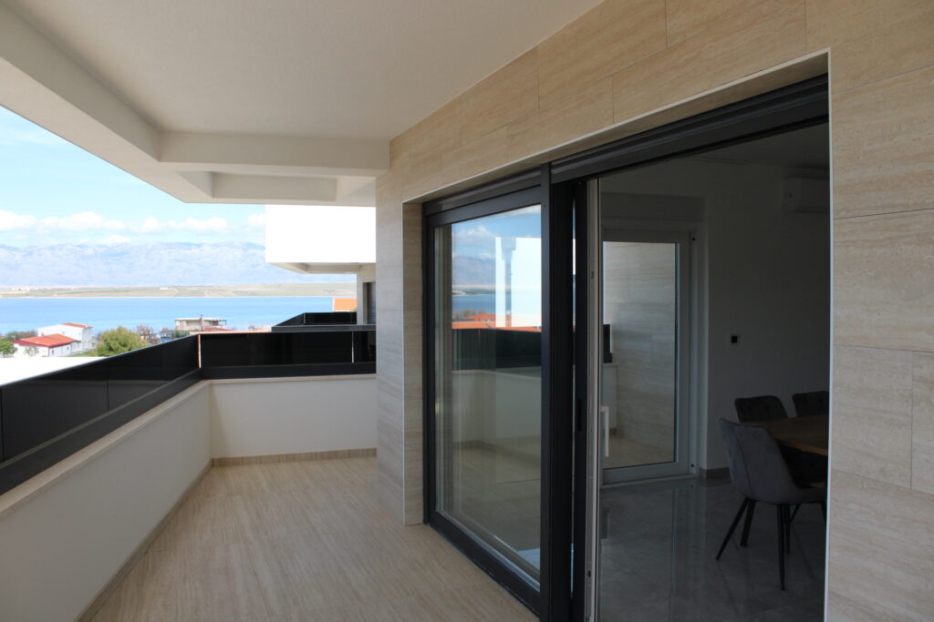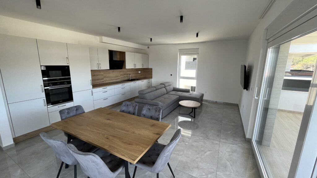 A második emeleti apartmanból lenyűgöző panoráma tárul elénk a tengerre és a környező tájra. Modern berendezése és a csendes környezet tökéletes választás a nyugodt pihenésre vágyóknak.